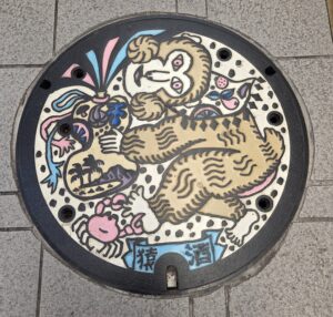 このご当地マンホールは、「猿酒」という民話をモチーフにしたデザインでガレリア竹町通りに設置されています。